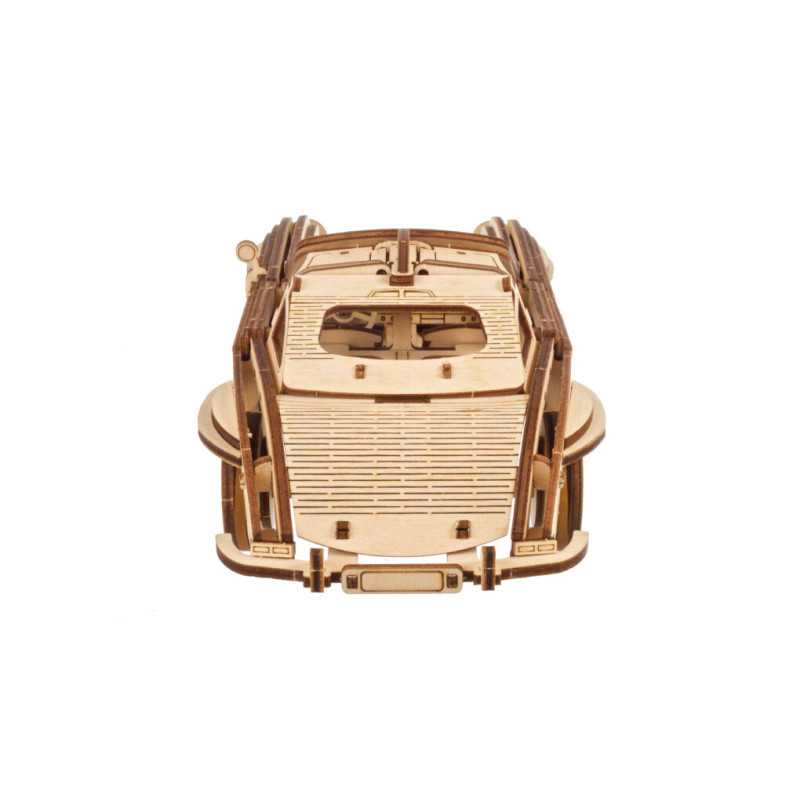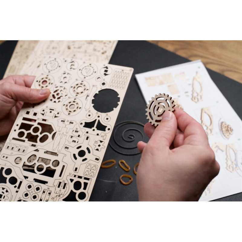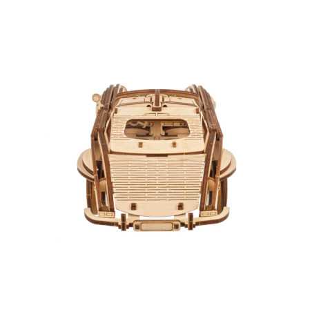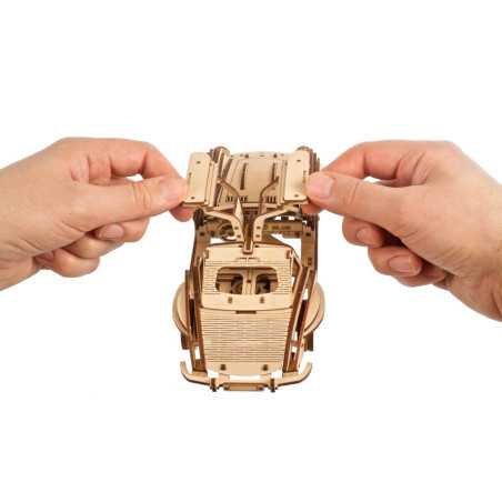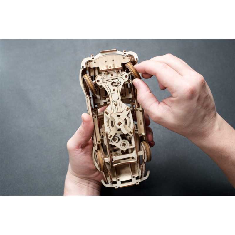 Trzecie auto do samodzielnego składania w kolekcji Dual Motors to zgrabny, drewniany model sportowego samochodu wykonany w skali 1:24 oraz wyposażony w dwa tryby działania. Możesz samodzielnie nakręcić samochód kluczem zapadkowym znajdującym się pod zdejmowanym podwoziem lub pociągnąć go do tyłu wzdłuż płaskiej powierzchni, a następnie puścić. Nasz nowy model udoskonaliliśmy o otwieraną maskę, pod którą kryje się silnik – serce naszego auta wykonane z drewnianych elementów. Wielbiciele naturalnych materiałów docenią solidne wykonanie modelu z laserowo przyciętych drewienek, wydzielających naturalny aromat tego surowca. Tak samo jak w przypadku innych modeli od Ugears, zalecamy zeszlifowanie i nawoskowanie wszystkich elementów zaznaczonych w instrukcji dla ich płynnego, harmonijnego działania oraz perfekcyjnego wyglądu złożonego modelu.