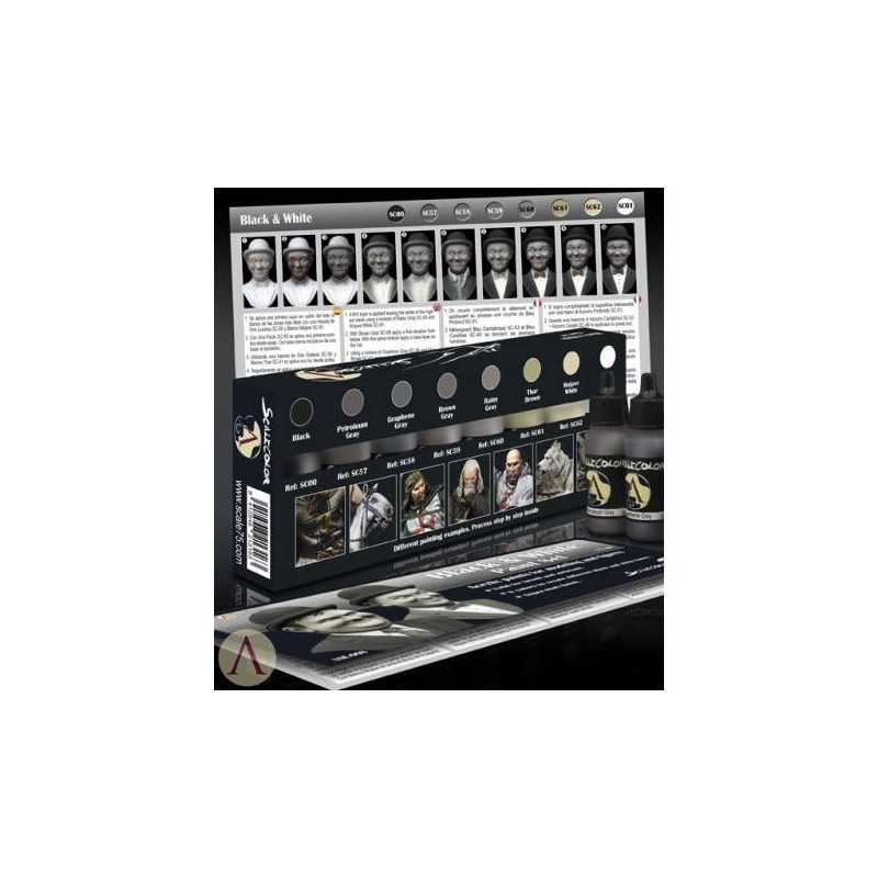 Zestaw ośmiu farb w odcieniach szarości od Scale 75.  Jeśli kiedykolwiek chciałeś malować w stylu czarno-białego filmu - te farby będą jak znalazł!  Przydadzą się też przy uzyskiwaniu odpowiednich, stonowanych kolorów przy białych lub szarych elementach figurek.    Zestaw zawiera farby ScaleColor: White  Mojawe White  Thar Brown  Rainy Grey  Brown Grey  Graphene Grey  Petroleum Grey  Black  Wszystkie w 17 ml buteleczkach z zakraplaczem.  Sprawdzą się zarówno do malowania pędzlami, jak i aerografem.
