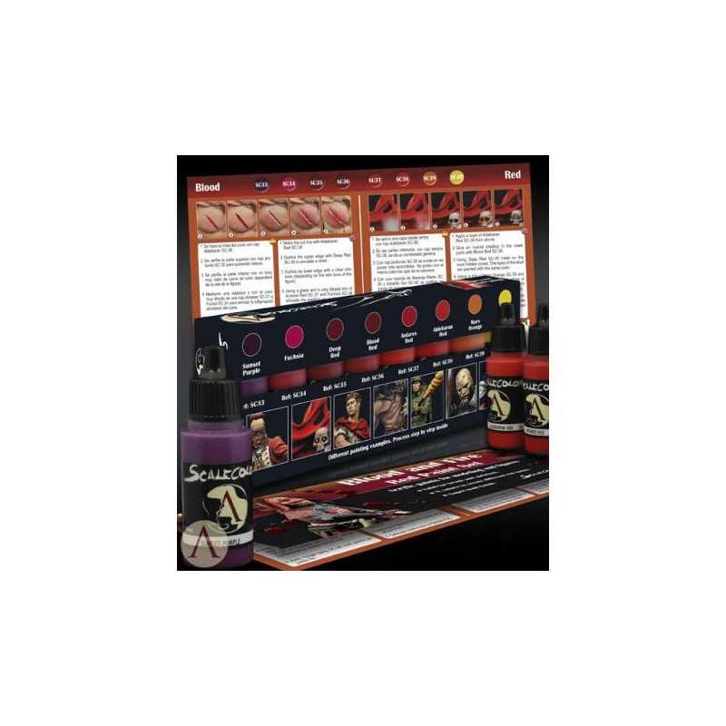 Zestaw ośmiu farb w odcieniach krwi i ognia od Scale 75.  Jeśli potrzebujesz by ogień wyglądał jak żywy a z żył miniaturek tryskała prawdziwa krew - ten zestaw jest dla Ciebie.  Przydadzą się też przy uzyskiwaniu odpowiednich, stonowanych kolorów przy żółtych i czerwonych elementach figurek.    Zestaw zawiera farby ScaleColor: Sol Yellow  Mars Orange  Aldebaran Red  Antares Red  Deep Red  Blood Red  Fuchsia  Sunset Purple    Wszystkie w 17 ml buteleczkach z zakraplaczem.  Sprawdzą się zarówno do malowania pędzlami, jak i aerografem.