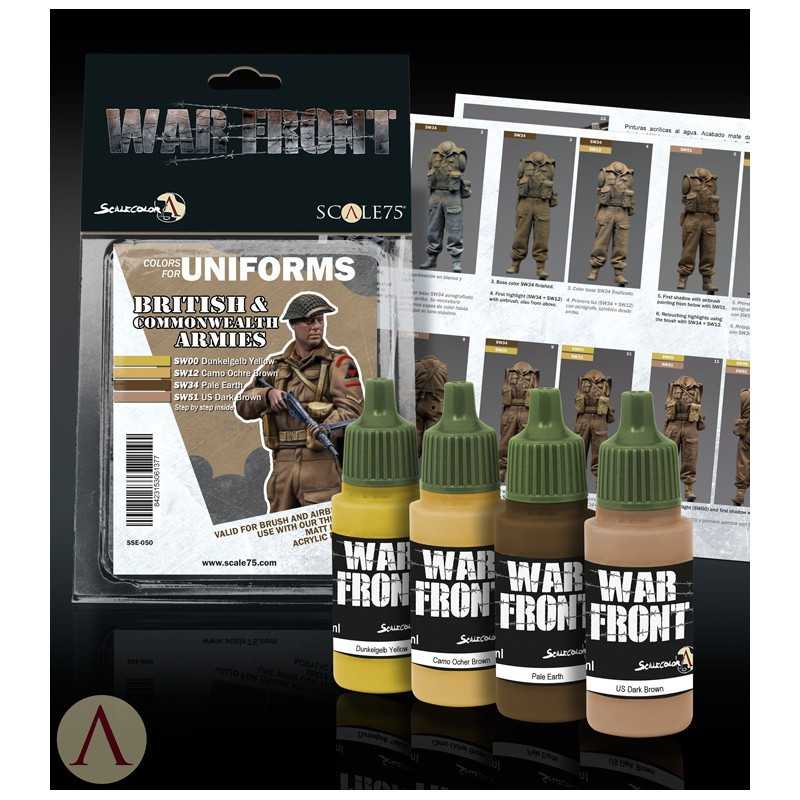 Zestaw British and Commonwealth Armies Paint set zawiera cztery podstawowe kolory dla pomalowania figurek brytyjskiej piechoty z okresu II Wojny światowej.  W środku opakowania odnajdziesz też prosty instruktaż, jak nakładać farby.    W zestawie odnajdziesz farby WarFront:  Dunkelgelb yellow  Camo ochre brown  Pale Earth  US dark brown    Wszystkie w 17 ml buteleczkach z zakraplaczem.  Sprawdzą się zarówno do malowania pędzlami, jak i aerografem.