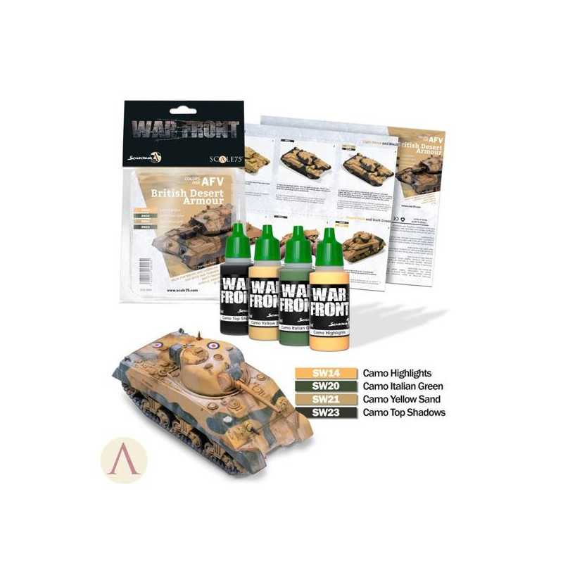 Zestaw British Desert Armor Paint Set zawiera cztery podstawowe kolory dla pomalowania modeli brytyjskich pojazdów pancernych używanych w Afryce w czasie II Wojny światowej.  W środku opakowania odnajdziesz też prosty instruktaż, jak nakładać farby.    W zestawie odnajdziesz farby WarFront:  Camo Highlight  Camo Yellow Sand  Camo Italian Green  Camo Top Shadows    Wszystkie w 17 ml buteleczkach z zakraplaczem.  Sprawdzą się zarówno do malowania pędzlami, jak i aerografem.