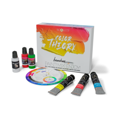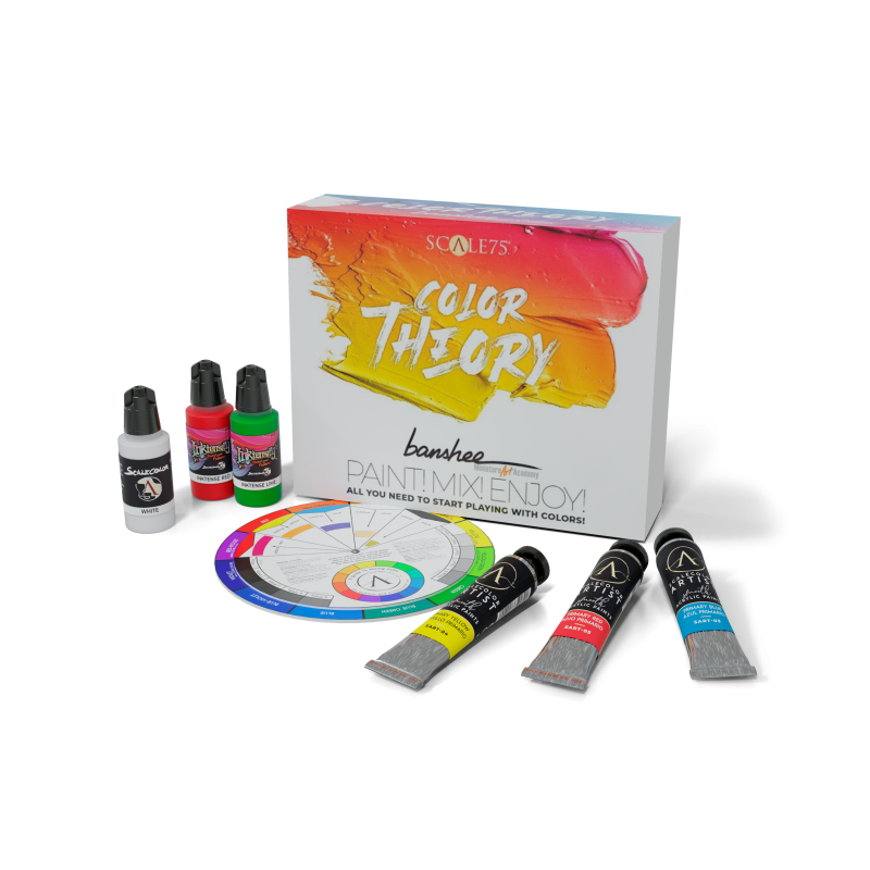 Alfonso Giraldes Banshee, jeden z najbardziej uznanych artystów w świecie miniatur z wieloletnią karierą zawodową - twórca znakomitego albumu Banshee - A colorful mind, stworzył kolejny doskonały produkt dla Scale 75.  Dokonał przepięknej selekcji farb oraz tuszy i dzięki temu powstał zestaw Color Theory Banshee Paint Set.    W zestawie otrzymasz: Specjalne koło kolorów, które pozwoli ci łatwiej zrozumieć, w kierunku jakiego odcienia mieszasz farby,  Jedenaście farb artystycznych w 20 ml tubkach, w tym:  Farbę białą  Podstawową farbę niebieską  Podstawową farbę żółtą  Podstawową farbę czerwoną  Intensywną farbę żółtą  Farbę pomarańczową  Farbę w kolorze magenta  Farbę turkusową  Farbę niebieską kobaltową  Farbę Białą Wanilię  Farbę Pastelowy Fiolet  Sześć tuszy inktense w 17 mil butelkach z zakraplaczem w tym:  Inktense Black  Inktense Violet  Inktense Green  Inktense Red  Inktense Cyan  Inktense Lime  Białą farbę ScaleColor w 17 ml butelce z zakraplaczem,