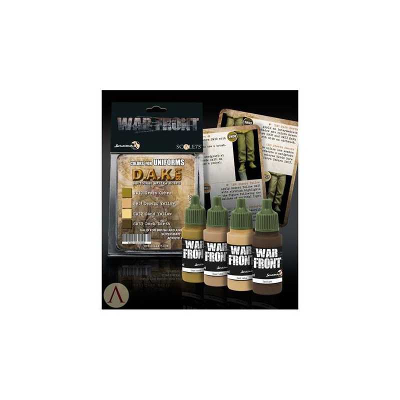 Zestaw D.A.K. 1 Paint Set zawiera cztery podstawowe kolory dla pomalowania umundurowania niemieckiego korpusu Afrika Corps z II wojny światowej.   W środku opakowania odnajdziesz też prosty instruktaż, jak nakładać farby.    W zestawie odnajdziesz farby WarFront:  Green Ochre  Desert Yellow  Sand Yellow  Dark Earth    Wszystkie w 17 ml buteleczkach z zakraplaczem.  Sprawdzą się zarówno do malowania pędzlami, jak i aerografem.