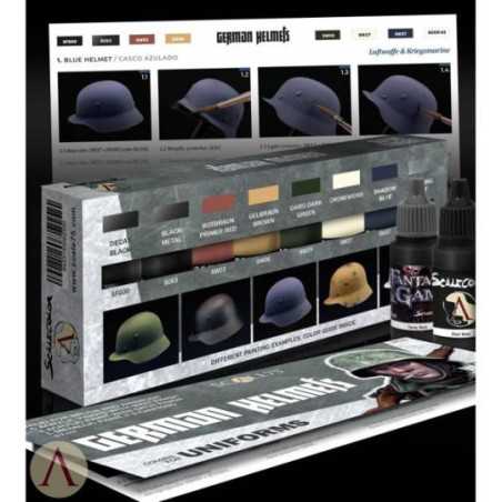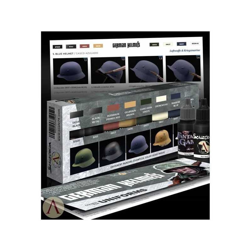 Zestaw ośmiu farb doskonałych do niemieckich hełmów z II Wojny Światowej od Scale 75.  Przydadzą się też przy innych projektach, w których potrzebujesz mieć duży wybór farb!      Zestaw zawiera Farby Warfront: Shadow Blue  Camo Dark Green  CremeWeiss  Gelbraun Brown  Rotbraun Primer Red  Farbę Scale Color Metal Alchemy Black Metal   Farbę Magic & Fantasy Decay Black  Preparat Chipping Soft   Wszystkie  produkty są w 17 ml buteleczkach z zakraplaczem.  Sprawdzą się zarówno do malowania pędzlami, jak i aerografem.