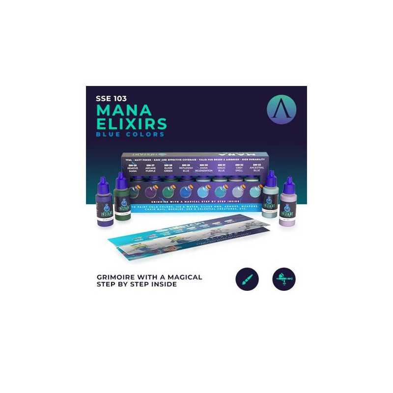 Zestaw Mana Elixir Paint Set to wszystko, czego potrzebujesz, by podładować swe magiczne umiejętności! Znakomite odcienie błękitu oraz paleta kolorów ich podkreślających, pozwolą Ci na jeszcze bardziej realistyczne eteralne ciała duchów oraz demonów. Wszelkie niebieskie elementy zbroi i uzbrojenia staną się drobnostką z tym kompletem barw.    Farby Instant są znakomitym wyborem dla początkujących malarzy. Wystarczy pokryć figurkę jasnym podkładem w spreju następnie pomalować wybrane elementy farbą Instant i patrzeć jak cienie oraz highlighty robią się prawie same!    W zestawie otrzymasz Farby Instant:  Replenish Blue  Remove Mana  Arcane Purple  Elixir Green  Mana Regeneration  Magic Blue  Grey Spell  Ancestral Blue