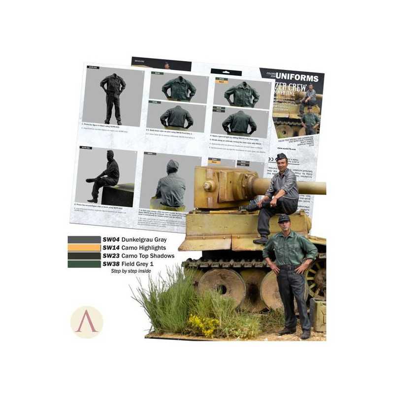 Zestaw Panzer Crew - Summertime Paint Set zawiera cztery kolory do pomalowania umundurowania letniego niemieckich pancerniaków z II wojny światowej.   W środku opakowania odnajdziesz też prosty instruktaż, jak nakładać farby.    W zestawie odnajdziesz farby WarFront:  Field Grey 1 Camo Highlights DunkelGrau Grey Camo Top Shadows    Wszystkie w 17 ml buteleczkach z zakraplaczem.  Sprawdzą się zarówno do malowania pędzlami, jak i aerografem.