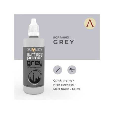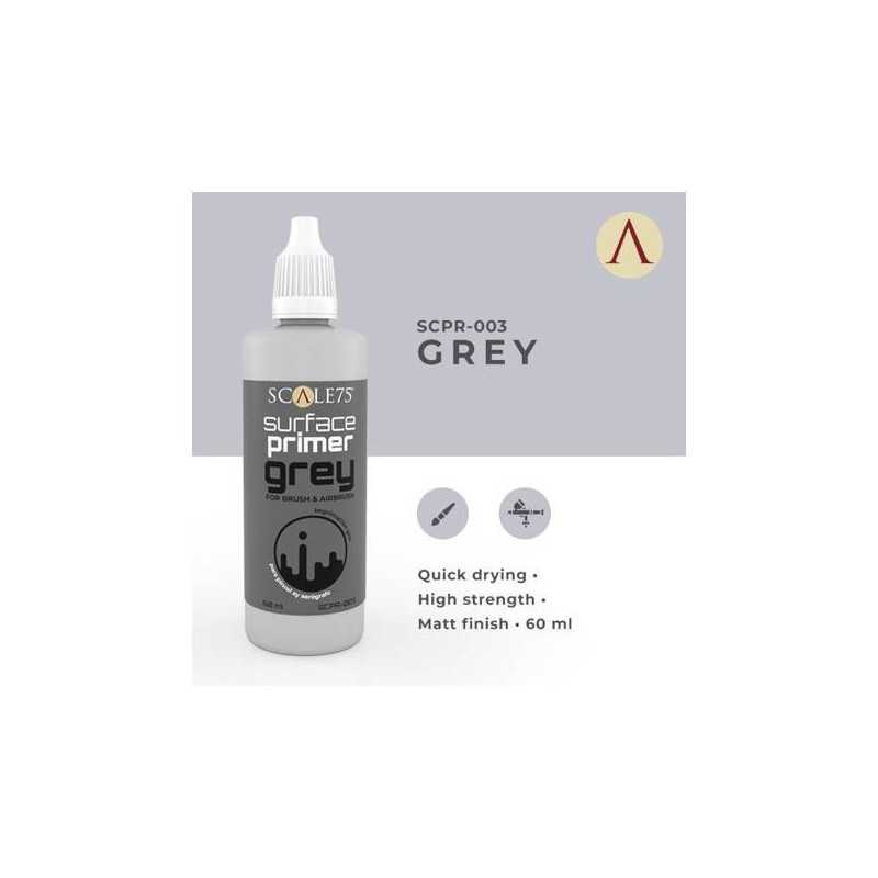 Szybkoschnący podkład do figurek w kolorze szarym od Scale 75.    Można nakładać go zarówno pędzlem, jak i aerografem. Mocno trzyma się nakładanej powierzchni, a duża, 60-mililitrowa butelka pozwoli na wykonanie dużej ilości projektów. Wykończenie matowe.