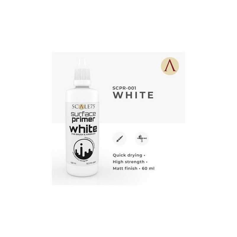 Szybkoschnący podkład do figurek w kolorze białym od Scale 75.    Można nakładać go zarówno pędzlem, jak i aerografem. Mocno trzyma się nakładanej powierzchni, a duża, 60-mililitrowa butelka pozwoli na wykonanie dużej ilości projektów. Wykończenie matowe.