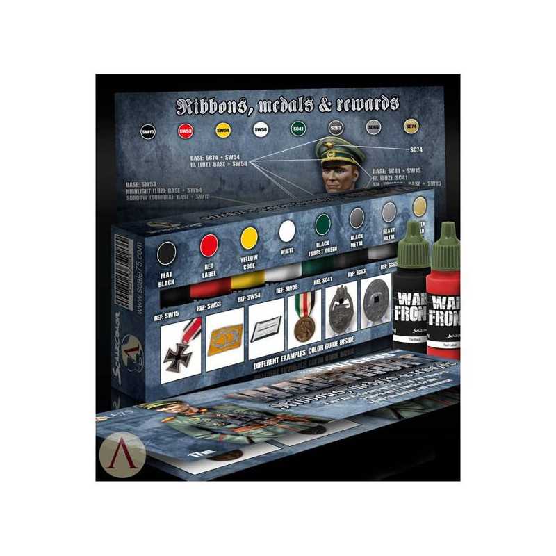 Zestaw ośmiu farb w kolorach odznaczeń i medali od Scale 75.  Jeśli potrzebujesz prawdziwych medali na Swoich jednostkach  - ten zestaw jest dla Ciebie.  Przydadzą się też przy przeróżnych innych projektach, gdzie potrzebna jest szeroka gama kolorów.    Zestaw zawiera farby ScaleColor Metal Alchemy: Black Metal  Heavy Metal  Elven Gold  farby Warfront: Yellow Code  White  Red Label  Flat Black  farbę ScaleColor Black Forest Green   Wszystkie w 17 ml buteleczkach z zakraplaczem.  Sprawdzą się zarówno do malowania pędzlami, jak i aerografem.