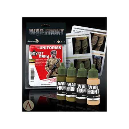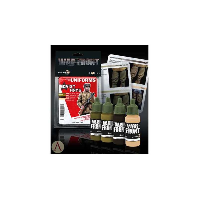 Zestaw Soviet Army Paint Set zawiera cztery podstawowe kolory dla pomalowania figurek piechoty radzieckiej z okresu II Wojny Światowej.  W środku opakowania odnajdziesz też prosty instruktaż, jak nakładać farby.    W zestawie odnajdziesz farby WarFront:  Braun  Camo Dark Brown  GrauGrun Grey  Russian Uniform    Wszystkie w 17 ml buteleczkach z zakraplaczem.  Sprawdzą się zarówno do malowania pędzlami, jak i aerografem.