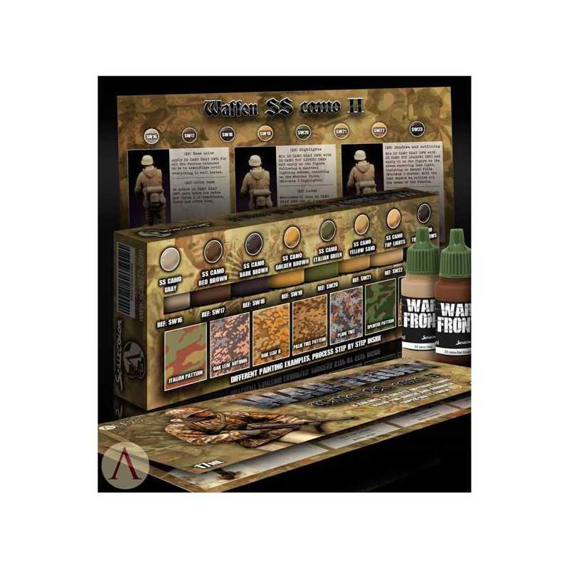Kolejny zestaw ośmiu farb w kolorach niemieckich oddziałów od Scale 75.  Jeśli potrzebujesz, by Twoich niemieckich żołnierzy nie było widać - ten zestaw jest dla Ciebie.  Przydadzą się też przy projektach wymagających szerokiej gamy barw!    Zestaw zawiera farby WarFront: Camo Grey Camo Red Brown  Camo Dark Brown  Camo Golden Brown  Camo Italian Green  Camo Yellow Sand  Camo Top Lights  Camo Top Shadows   Wszystkie w 17 ml buteleczkach z zakraplaczem.  Sprawdzą się zarówno do malowania pędzlami, jak i aerografem.