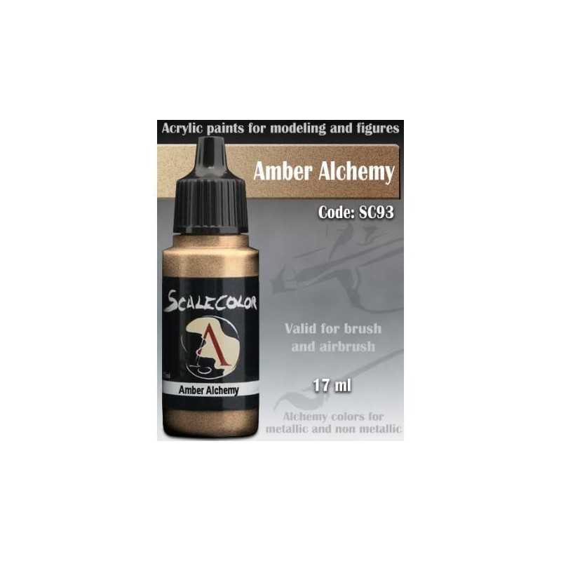 Seria Metal n' Alchemy to znakomite farby akrylowe z metalicznym pigmentem od Scale 75.  Amber Alchemy oferuje bursztynowy metaliczny kolor, doskonały na miecze elfów oraz drobną biżuterię.    Farba w buteleczce o pojemności 17 ml z zakraplaczem. Idealna zarówno do malowania pędzlem, jak i aerografem. Produkt charakteryzuje się wysoką intensywnością koloru.    Modelarz radzi: jak z większością farb długie stanie, nawet w magazynie, może powodować separacje medium od pigmentu, dlatego też pamiętaj, by dobrze wstrząsnąć butelką przed użyciem.  jeśli chcesz przyśpieszyć etap mieszania, warto zaopatrzyć się w metalowe kulki i wrzucić je do buteleczki.  farba posłuży ci dłużej, jeśli użyjesz mokrej palety.
