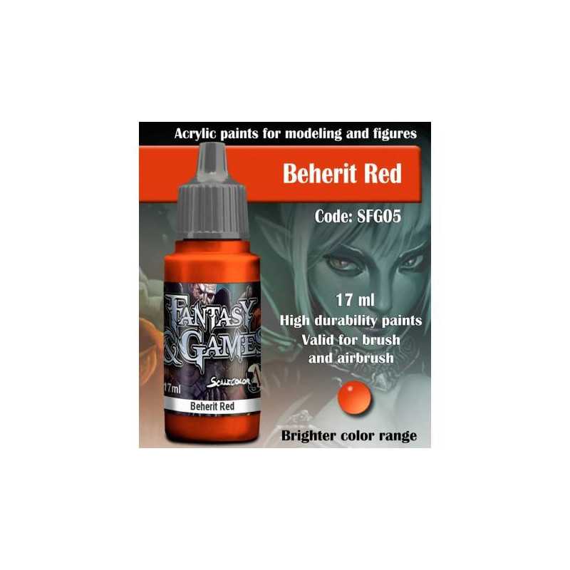 Scale 75 stworzył specjalną grupę farbek dla bitewniaków. Seria Fantasy & Games odznacza się wysoką wytrzymałością oraz jaśniejszą gamą kolorów.  Beherit Red pobudzi Twe Bloodlettery do walki, a Squigi do jeszcze wyższych skoków swym jasnoczerwonym tonem.    Farba w buteleczce o pojemności 17 ml z zakraplaczem. Idealna zarówno do malowania pędzlem, jak i aerografem.    Modelarz radzi: jak z większością farb długie stanie, nawet w magazynie, może powodować separacje medium od pigmentu, dlatego też pamiętaj, by dobrze wstrząsnąć butelką przed użyciem.  jeśli chcesz przyśpieszyć etap mieszania, warto zaopatrzyć się w metalowe kulki i wrzucić je do buteleczki.  farba posłuży ci dłużej, jeśli użyjesz mokrej palety.