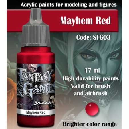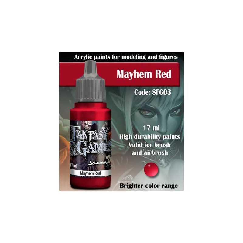 Scale 75 stworzył specjalną grupę farbek dla bitewniaków. Seria Fantasy & Games odznacza się wysoką wytrzymałością oraz jaśniejszą gamą kolorów.  Mayhem Red podkreśli krwiste zbroje Blood Knightów jak również ubrania czerwonych latarni swym znakomitym czerwonym tonem.     Farba w buteleczce o pojemności 17 ml z zakraplaczem. Idealna zarówno do malowania pędzlem, jak i aerografem.    Modelarz radzi: jak z większością farb długie stanie, nawet w magazynie, może powodować separacje medium od pigmentu, dlatego też pamiętaj, by dobrze wstrząsnąć butelką przed użyciem.  jeśli chcesz przyśpieszyć etap mieszania, warto zaopatrzyć się w metalowe kulki i wrzucić je do buteleczki.  farba posłuży ci dłużej, jeśli użyjesz mokrej palety.