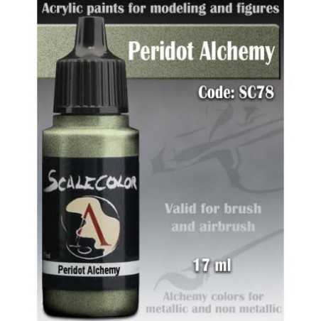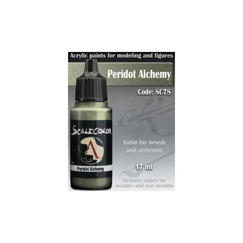Seria Metal n' Alchemy to znakomite farby akrylowe z metalicznym pigmentem od Scale 75.  Peridot Alchemy oferuje jasnozielony metaliczny kolor, doskonały na łuski wywerny czy też obślizgłe miecze nurglitów.    Farba w buteleczce o pojemności 17 ml z zakraplaczem. Idealna zarówno do malowania pędzlem, jak i aerografem. Produkt charakteryzuje się wysoką intensywnością koloru.    Modelarz radzi: jak z większością farb długie stanie, nawet w magazynie, może powodować separacje medium od pigmentu, dlatego też pamiętaj, by dobrze wstrząsnąć butelką przed użyciem.  jeśli chcesz przyśpieszyć etap mieszania, warto zaopatrzyć się w metalowe kulki i wrzucić je do buteleczki.  farba posłuży ci dłużej, jeśli użyjesz mokrej palety.