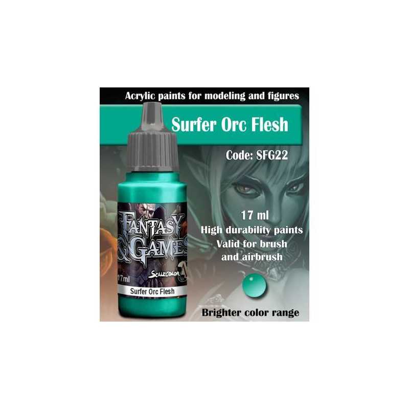 Scale 75 stworzył specjalną grupę farbek dla bitewniaków. Seria Fantasy & Games odznacza się wysoką wytrzymałością oraz jaśniejszą gamą kolorów.  Niebieskozielony Surfer Orc Flesh doda jakości Twoim Wrightknight'om, jak również przyda się przy łuskach lewiatanów.    Farba w buteleczce o pojemności 17 ml z zakraplaczem. Idealna zarówno do malowania pędzlem, jak i aerografem.    Modelarz radzi: jak z większością farb długie stanie, nawet w magazynie, może powodować separacje medium od pigmentu, dlatego też pamiętaj, by dobrze wstrząsnąć butelką przed użyciem.  jeśli chcesz przyśpieszyć etap mieszania, warto zaopatrzyć się w metalowe kulki i wrzucić je do buteleczki.  farba posłuży ci dłużej, jeśli użyjesz mokrej palety.