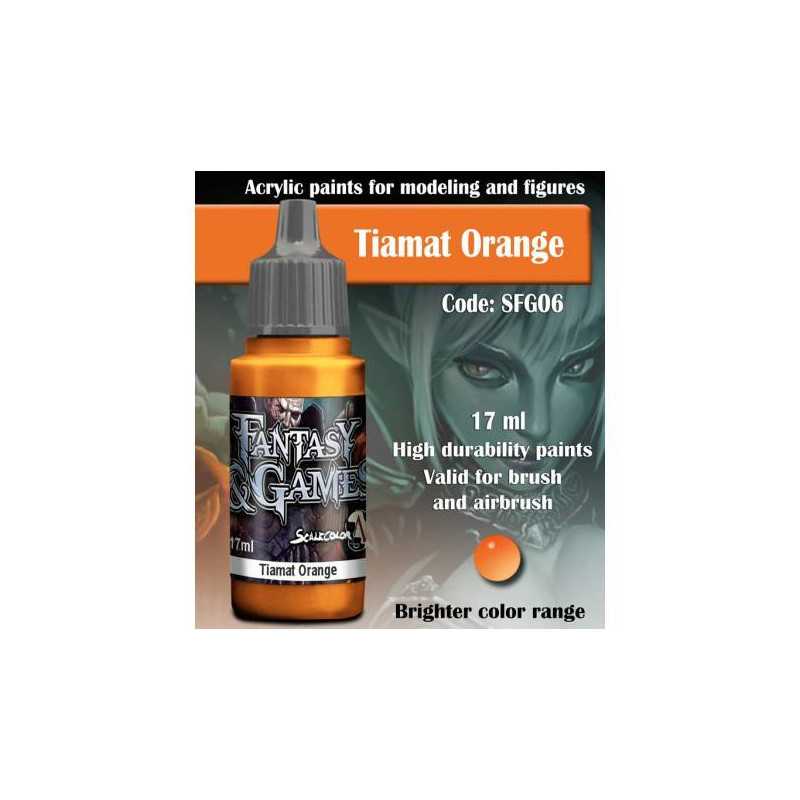Scale 75 stworzył specjalną grupę farbek dla bitewniaków. Seria Fantasy & Games odznacza się wysoką wytrzymałością oraz jaśniejszą gamą kolorów.  Tiamat Orange przyda się zarówno przy pomarańczowych zbrojach Tau jak i przy drobnych ciałach Seraphonowych Skinków.    Farba w buteleczce o pojemności 17 ml z zakraplaczem. Idealna zarówno do malowania pędzlem, jak i aerografem.    Modelarz radzi: jak z większością farb długie stanie, nawet w magazynie, może powodować separacje medium od pigmentu, dlatego też pamiętaj, by dobrze wstrząsnąć butelką przed użyciem.  jeśli chcesz przyśpieszyć etap mieszania, warto zaopatrzyć się w metalowe kulki i wrzucić je do buteleczki.  farba posłuży ci dłużej, jeśli użyjesz mokrej palety.