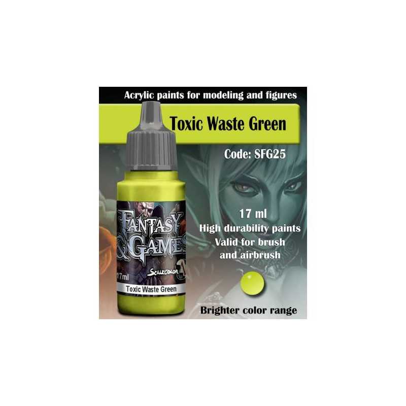 Scale 75 stworzył specjalną grupę farbek dla bitewniaków. Seria Fantasy & Games odznacza się wysoką wytrzymałością oraz jaśniejszą gamą kolorów.  Żółtozielony Toxic Waste Green przyozdobi każdego supermutanta z pustkowi Fallouta, jak również doda toksycznego smaczku Skaveńskim Poison Wind Globader'om.    Farba w buteleczce o pojemności 17 ml z zakraplaczem. Idealna zarówno do malowania pędzlem, jak i aerografem.    Modelarz radzi: jak z większością farb długie stanie, nawet w magazynie, może powodować separacje medium od pigmentu, dlatego też pamiętaj, by dobrze wstrząsnąć butelką przed użyciem.  jeśli chcesz przyśpieszyć etap mieszania, warto zaopatrzyć się w metalowe kulki i wrzucić je do buteleczki.  farba posłuży ci dłużej, jeśli użyjesz mokrej palety.