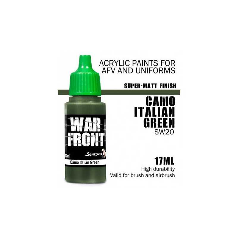 Seria WarFront od Scale 75 to kolory dopasowane do natury wojny - znajdziesz tu wszystko, czego będziesz potrzebować przy malowaniu wozów pancernych, samolotów czy też piechoty.  Szarozielony kolor Camo Italian Green sprawdzi się znakomicie przy ubiorach żołnierzy włoskich na froncie wschodnim.     Farba w buteleczce o pojemności 17 ml z zakraplaczem. Idealna zarówno do malowania pędzlem, jak i aerografem. Po wyschnięciu cechuje się matowym wykończeniem.    Modelarz radzi: jak z większością farb długie stanie, nawet w magazynie, może powodować separacje medium od pigmentu, dlatego też pamiętaj, by dobrze wstrząsnąć butelką przed użyciem.  jeśli chcesz przyśpieszyć etap mieszania, warto zaopatrzyć się w metalowe kulki i wrzucić je do buteleczki.  farba posłuży ci dłużej, jeśli użyjesz mokrej palety.
