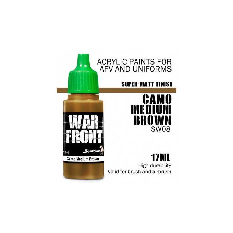 Seria WarFront od Scale 75 to kolory dopasowane do natury wojny - znajdziesz tu wszystko, czego będziesz potrzebować przy malowaniu wozów pancernych, samolotów czy też piechoty.  Brązowy kolor Camo Medium Brown podkreśli kamuflaż amerykańskich Marines.    Farba w buteleczce o pojemności 17 ml z zakraplaczem. Idealna zarówno do malowania pędzlem, jak i aerografem. Po wyschnięciu cechuje się matowym wykończeniem.    Modelarz radzi: jak z większością farb długie stanie, nawet w magazynie, może powodować separacje medium od pigmentu, dlatego też pamiętaj, by dobrze wstrząsnąć butelką przed użyciem.  jeśli chcesz przyśpieszyć etap mieszania, warto zaopatrzyć się w metalowe kulki i wrzucić je do buteleczki.  farba posłuży ci dłużej, jeśli użyjesz mokrej palety.