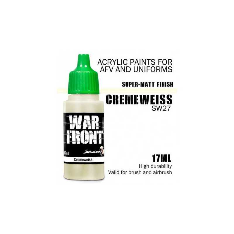 Seria WarFront od Scale 75 to kolory dopasowane do natury wojny - znajdziesz tu wszystko, czego będziesz potrzebować przy malowaniu wozów pancernych, samolotów czy też piechoty.  Szarobiały kolor Cremeweiss podkreśli biel na kamuflażu zimowym wermachtu.     Farba w buteleczce o pojemności 17 ml z zakraplaczem. Idealna zarówno do malowania pędzlem, jak i aerografem. Po wyschnięciu cechuje się matowym wykończeniem.    Modelarz radzi: jak z większością farb długie stanie, nawet w magazynie, może powodować separacje medium od pigmentu, dlatego też pamiętaj, by dobrze wstrząsnąć butelką przed użyciem.  jeśli chcesz przyśpieszyć etap mieszania, warto zaopatrzyć się w metalowe kulki i wrzucić je do buteleczki.  farba posłuży ci dłużej, jeśli użyjesz mokrej palety.