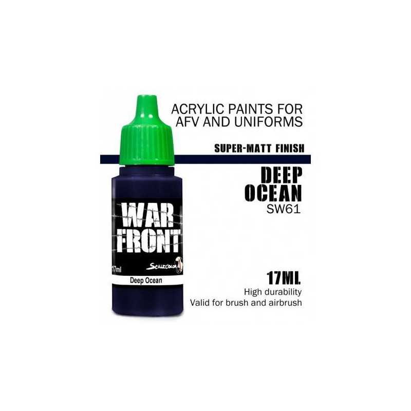 Seria WarFront od Scale 75 to kolory dopasowane do natury wojny - znajdziesz tu wszystko, czego będziesz potrzebować przy malowaniu wozów pancernych, samolotów czy też piechoty.  Ciemnoniebieski kolor Deep Ocean przyozdobi cienie na mundurach Kriegsmarine.    Farba w buteleczce o pojemności 17 ml z zakraplaczem. Idealna zarówno do malowania pędzlem, jak i aerografem. Po wyschnięciu cechuje się matowym wykończeniem.    Modelarz radzi: jak z większością farb długie stanie, nawet w magazynie, może powodować separacje medium od pigmentu, dlatego też pamiętaj, by dobrze wstrząsnąć butelką przed użyciem.  jeśli chcesz przyśpieszyć etap mieszania, warto zaopatrzyć się w metalowe kulki i wrzucić je do buteleczki.  farba posłuży ci dłużej, jeśli użyjesz mokrej palety.