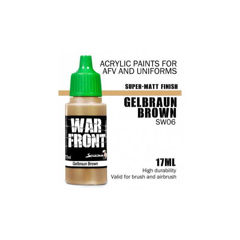 Seria WarFront od Scale 75 to kolory dopasowane do natury wojny - znajdziesz tu wszystko, czego będziesz potrzebować przy malowaniu wozów pancernych, samolotów czy też piechoty.  Żółtobrązowy Gelbraun Brown przyda się zarówno przy mundurze japońskiego oficera jak i przy mundurze legionu Condor.    Farba w buteleczce o pojemności 17 ml z zakraplaczem. Idealna zarówno do malowania pędzlem, jak i aerografem. Po wyschnięciu cechuje się matowym wykończeniem.    Modelarz radzi: jak z większością farb długie stanie, nawet w magazynie, może powodować separacje medium od pigmentu, dlatego też pamiętaj, by dobrze wstrząsnąć butelką przed użyciem.  jeśli chcesz przyśpieszyć etap mieszania, warto zaopatrzyć się w metalowe kulki i wrzucić je do buteleczki.  farba posłuży ci dłużej, jeśli użyjesz mokrej palety.