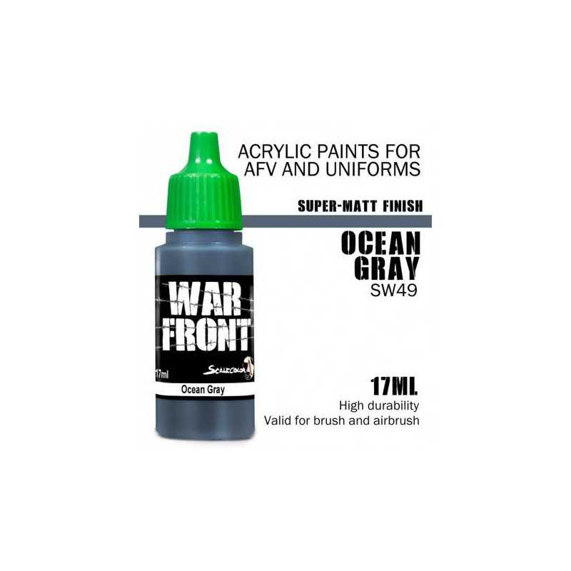 Seria WarFront od Scale 75 to kolory dopasowane do natury wojny - znajdziesz tu wszystko, czego będziesz potrzebować przy malowaniu wozów pancernych, samolotów czy też piechoty.  Szaroniebieski kolor Ocean Gray przyozdobi  skrzydła amerykańskiego Corsaira.    Farba w buteleczce o pojemności 17 ml z zakraplaczem. Idealna zarówno do malowania pędzlem, jak i aerografem. Po wyschnięciu cechuje się matowym wykończeniem.    Modelarz radzi: jak z większością farb długie stanie, nawet w magazynie, może powodować separacje medium od pigmentu, dlatego też pamiętaj, by dobrze wstrząsnąć butelką przed użyciem.  jeśli chcesz przyśpieszyć etap mieszania, warto zaopatrzyć się w metalowe kulki i wrzucić je do buteleczki.  farba posłuży ci dłużej, jeśli użyjesz mokrej palety.