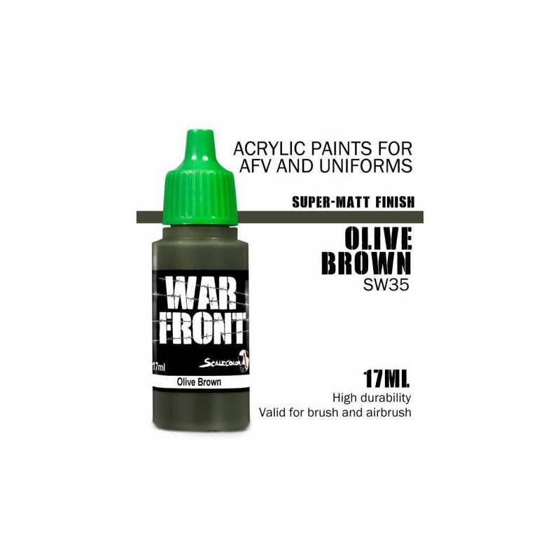 Seria WarFront od Scale 75 to kolory dopasowane do natury wojny - znajdziesz tu wszystko, czego będziesz potrzebować przy malowaniu wozów pancernych, samolotów czy też piechoty.  Ciemnozielony kolor Olive Brown podkreśli plecaki brytyjskich żołnierzy.    Farba w buteleczce o pojemności 17 ml z zakraplaczem. Idealna zarówno do malowania pędzlem, jak i aerografem. Po wyschnięciu cechuje się matowym wykończeniem.    Modelarz radzi: jak z większością farb długie stanie, nawet w magazynie, może powodować separacje medium od pigmentu, dlatego też pamiętaj, by dobrze wstrząsnąć butelką przed użyciem.  jeśli chcesz przyśpieszyć etap mieszania, warto zaopatrzyć się w metalowe kulki i wrzucić je do buteleczki.  farba posłuży ci dłużej, jeśli użyjesz mokrej palety.