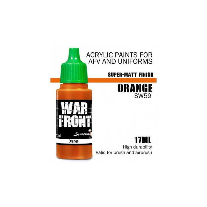 Seria WarFront od Scale 75 to kolory dopasowane do natury wojny - znajdziesz tu wszystko, czego będziesz potrzebować przy malowaniu wozów pancernych, samolotów czy też piechoty.  Pomarańczowy kolor Orange podkreśli rdzę na pojeździe każdego typu.    Farba w buteleczce o pojemności 17 ml z zakraplaczem. Idealna zarówno do malowania pędzlem, jak i aerografem. Po wyschnięciu cechuje się matowym wykończeniem.    Modelarz radzi: jak z większością farb długie stanie, nawet w magazynie, może powodować separacje medium od pigmentu, dlatego też pamiętaj, by dobrze wstrząsnąć butelką przed użyciem.  jeśli chcesz przyśpieszyć etap mieszania, warto zaopatrzyć się w metalowe kulki i wrzucić je do buteleczki.  farba posłuży ci dłużej, jeśli użyjesz mokrej palety.