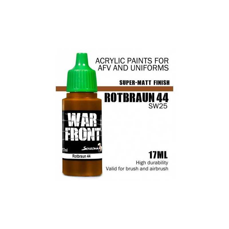 Seria WarFront od Scale 75 to kolory dopasowane do natury wojny - znajdziesz tu wszystko, czego będziesz potrzebować przy malowaniu wozów pancernych, samolotów czy też piechoty.  Czerwonobrązowy kolor Rotbraun 44 nada barw radzieckim drewnianym skrzyniom, jak również spełni się jako część kamuflażu Ambush.     Farba w buteleczce o pojemności 17 ml z zakraplaczem. Idealna zarówno do malowania pędzlem, jak i aerografem. Po wyschnięciu cechuje się matowym wykończeniem.    Modelarz radzi: jak z większością farb długie stanie, nawet w magazynie, może powodować separacje medium od pigmentu, dlatego też pamiętaj, by dobrze wstrząsnąć butelką przed użyciem.  jeśli chcesz przyśpieszyć etap mieszania, warto zaopatrzyć się w metalowe kulki i wrzucić je do buteleczki.  farba posłuży ci dłużej, jeśli użyjesz mokrej palety.
