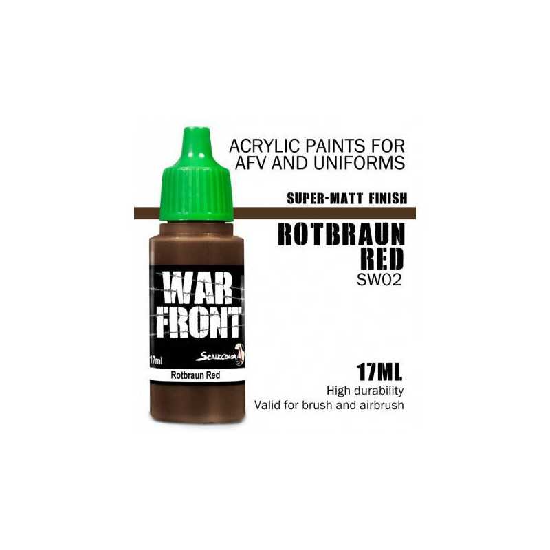 Seria WarFront od Scale 75 to kolory dopasowane do natury wojny - znajdziesz tu wszystko, czego będziesz potrzebować przy malowaniu wozów pancernych, samolotów czy też piechoty.  Brązowy kolor Rotbraun Red przyda się zarówno przy ładownicach na szelkach belgijskiego żołnierza z lat czterdziestych, jak i przy kamuflażu włoskiej tankietki.     Farba w buteleczce o pojemności 17 ml z zakraplaczem. Idealna zarówno do malowania pędzlem, jak i aerografem. Po wyschnięciu cechuje się matowym wykończeniem.    Modelarz radzi: jak z większością farb długie stanie, nawet w magazynie, może powodować separacje medium od pigmentu, dlatego też pamiętaj, by dobrze wstrząsnąć butelką przed użyciem.  jeśli chcesz przyśpieszyć etap mieszania, warto zaopatrzyć się w metalowe kulki i wrzucić je do buteleczki.  farba posłuży ci dłużej, jeśli użyjesz mokrej palety.