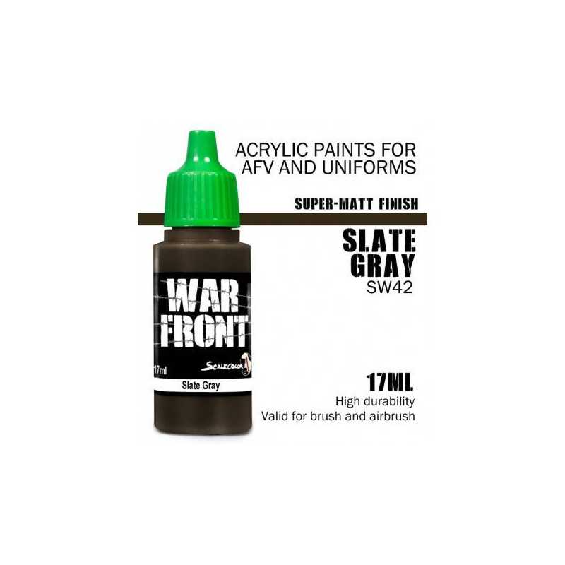 Seria WarFront od Scale 75 to kolory dopasowane do natury wojny - znajdziesz tu wszystko, czego będziesz potrzebować przy malowaniu wozów pancernych, samolotów czy też piechoty.  Ciemnoszarobrązowy kolor Slate Gray nada się na kamienne elementy dioramy, jak również na kombinezony niemieckich pancerniaków.    Farba w buteleczce o pojemności 17 ml z zakraplaczem. Idealna zarówno do malowania pędzlem, jak i aerografem. Po wyschnięciu cechuje się matowym wykończeniem.    Modelarz radzi: jak z większością farb długie stanie, nawet w magazynie, może powodować separacje medium od pigmentu, dlatego też pamiętaj, by dobrze wstrząsnąć butelką przed użyciem.  jeśli chcesz przyśpieszyć etap mieszania, warto zaopatrzyć się w metalowe kulki i wrzucić je do buteleczki.  farba posłuży ci dłużej, jeśli użyjesz mokrej palety.