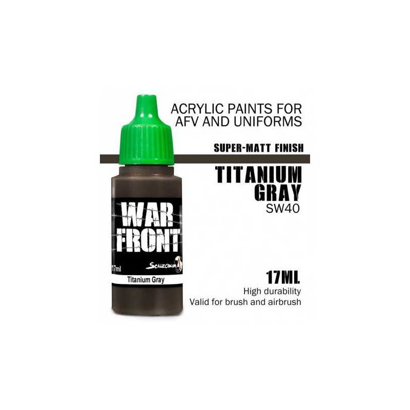 Seria WarFront od Scale 75 to kolory dopasowane do natury wojny - znajdziesz tu wszystko, czego będziesz potrzebować przy malowaniu wozów pancernych, samolotów czy też piechoty.  Szarobrązowy kolor Titanium Gray doda realnych zacieków na armatach oraz pojazdach wsparcia ogniowego.     Farba w buteleczce o pojemności 17 ml z zakraplaczem. Idealna zarówno do malowania pędzlem, jak i aerografem. Po wyschnięciu cechuje się matowym wykończeniem.    Modelarz radzi: jak z większością farb długie stanie, nawet w magazynie, może powodować separacje medium od pigmentu, dlatego też pamiętaj, by dobrze wstrząsnąć butelką przed użyciem.  jeśli chcesz przyśpieszyć etap mieszania, warto zaopatrzyć się w metalowe kulki i wrzucić je do buteleczki.  farba posłuży ci dłużej, jeśli użyjesz mokrej palety.