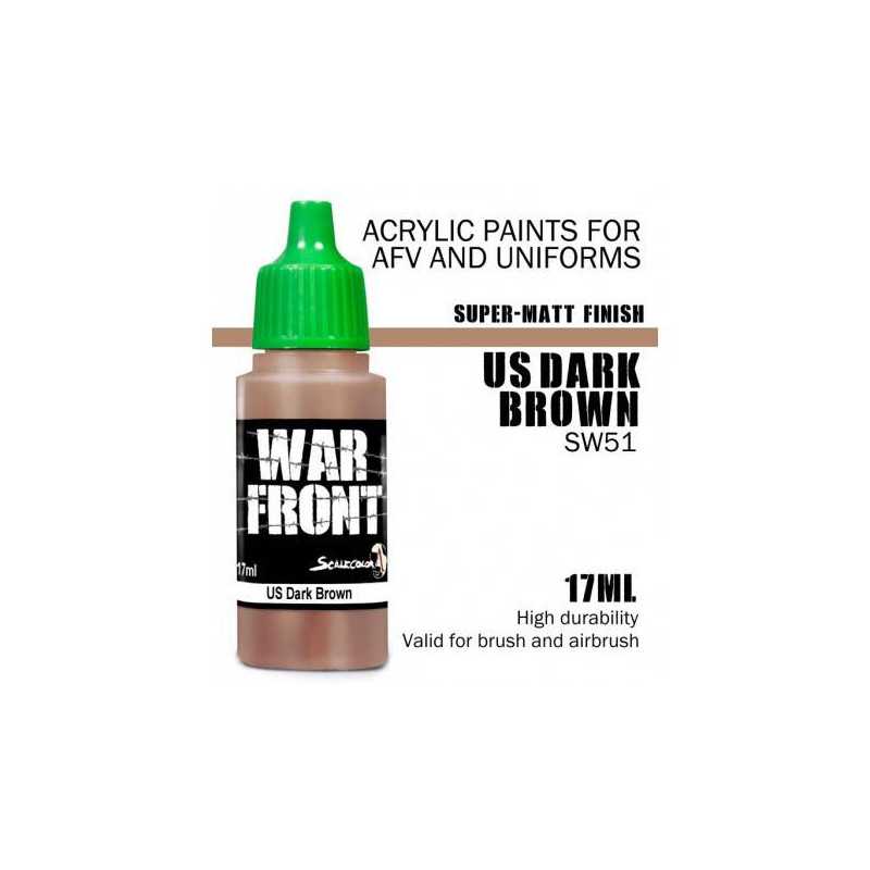 Seria WarFront od Scale 75 to kolory dopasowane do natury wojny - znajdziesz tu wszystko, czego będziesz potrzebować przy malowaniu wozów pancernych, samolotów czy też piechoty.  Brązowy kolor US Dark Brown podkreśli barwy butów oraz skórzanych akcesoriów.      Farba w buteleczce o pojemności 17 ml z zakraplaczem. Idealna zarówno do malowania pędzlem, jak i aerografem. Po wyschnięciu cechuje się matowym wykończeniem.    Modelarz radzi: jak z większością farb długie stanie, nawet w magazynie, może powodować separacje medium od pigmentu, dlatego też pamiętaj, by dobrze wstrząsnąć butelką przed użyciem.  jeśli chcesz przyśpieszyć etap mieszania, warto zaopatrzyć się w metalowe kulki i wrzucić je do buteleczki.  farba posłuży ci dłużej, jeśli użyjesz mokrej palety.