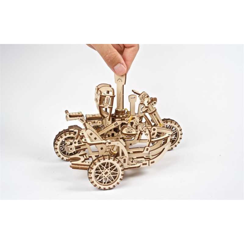 Tak jak powietrze, którym oddychamy i woda, którą pijemy, podróżowanie stało się dla nas niezbędną aktywnością. Szukając nowych doświadczeń, chcemy zobaczyć miejsca z dala od domu. Dlatego przygotuj się na wyruszenie w drogę z nowym towarzyszem przygód – szybkim i wytrzymałym Scramblerem UGR-10 z bocznym wózkiem! Czas otworzyć garaż, aby zmontować nowy fajny motocykl i zobaczyć, dokąd zaprowadzi Cię Twoja wyobraźnia! Miłej i zabawnej podróży z Scramblerem UGR-10 od Ugears!