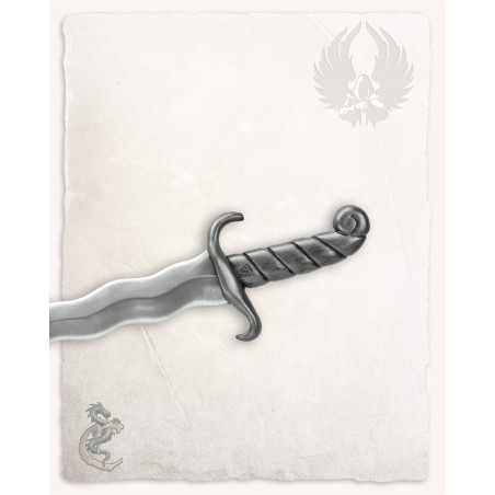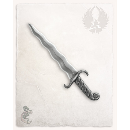 Skręcony jelec z zakrzywioną głowicą dodaje egzotycznego charakteru temu już i tak niezwykłemu sztyletowi o falistym, stalowym ostrzu. Pomimo ostro zakończonej końcówki, ten kris jest całkowicie bezpieczny do użycia w warunkach LARP i wykonany z naszej wyjątkowo trwałej pianki, zapewniającej lata zabawy i pojedynków! Ten kris doskonale uzupełni pas zabójcy, elfiego zwiadowcy lub egzotycznego kupca, a także będzie idealnym dodatkiem dla szlachcica z orientalnego królestwa.