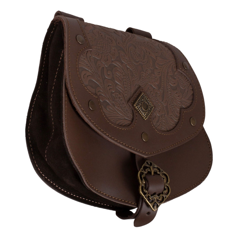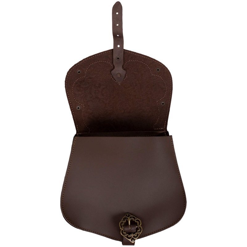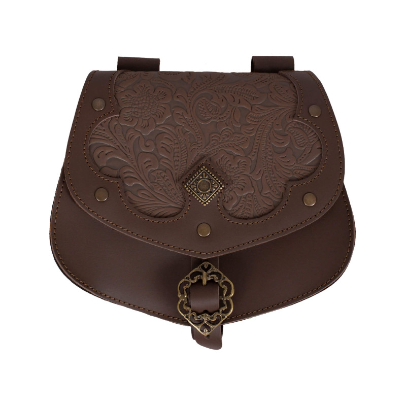 Sakiewka Acero łączy bogate zdobienia z funkcjonalnością. Wykonana z wysokiej jakości skóry, jest trwała i przyjemna w dotyku. Piękne tłoczenia oraz metalowe okucia nadają jej elegancki wygląd, a precyzyjnie odlana klamra zapewnia pewne zamknięcie. Dzięki solidnym szlufkom łatwo ją przymocować do pasa, a jej przestronne wnętrze pomieści wszystkie niezbędne drobiazgi. Idealny towarzysz na LARP oraz jarmarki średniowieczne.