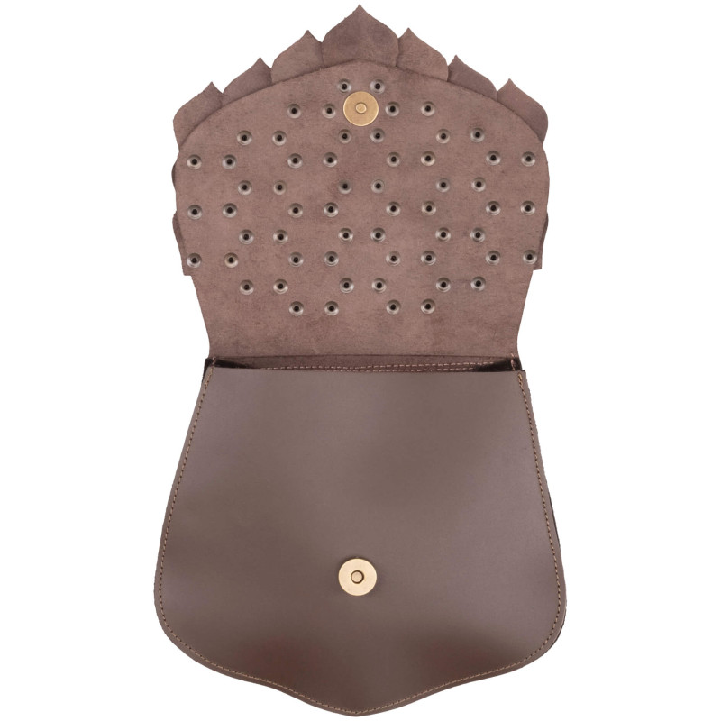 Na klapie znajdują się efektowne, skórzane łuski, które dodają odważnego charakteru.