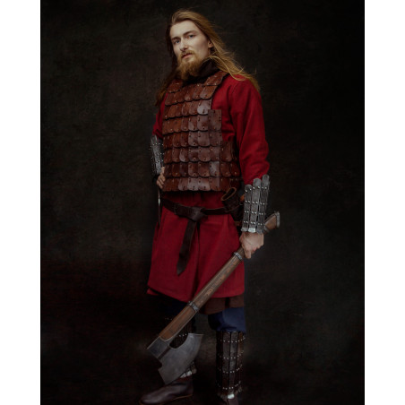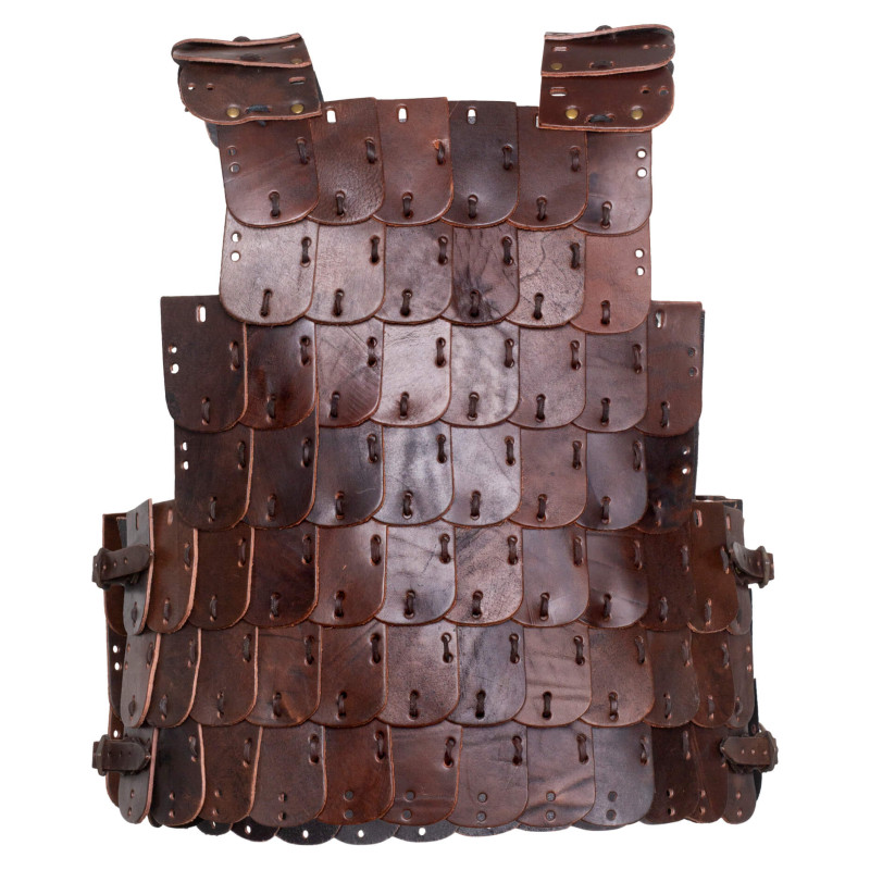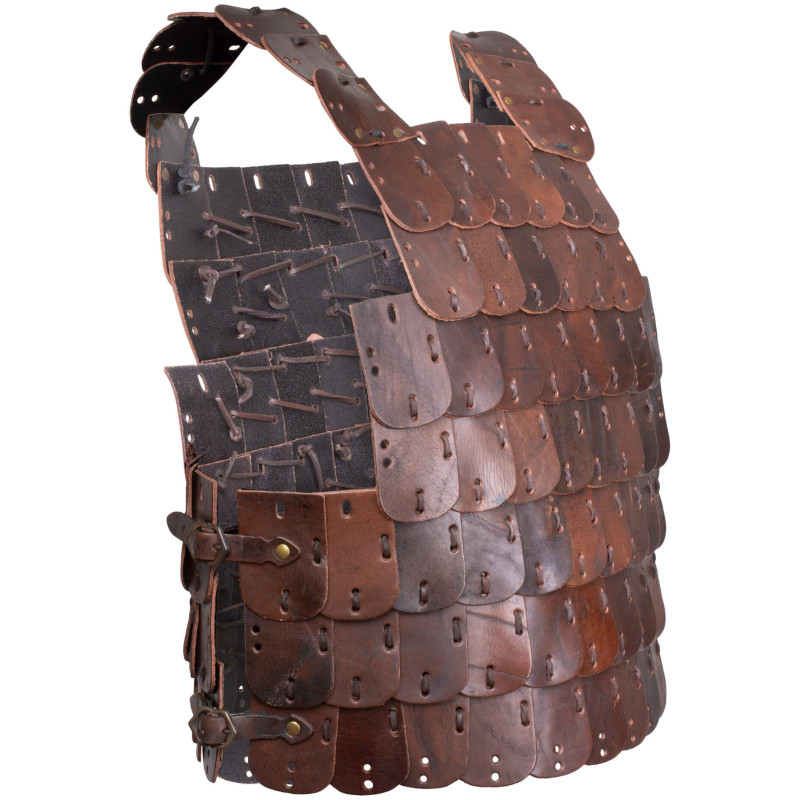Klasyczna zbroja skórzana zaprojektowana na podstawie historycznych wzorców z różnych ilustracji. Łuski są kwadratowe i ułożone pionowo. Są połączone skórzanymi paskami, co zapewnia pełną ruchomość. Połącz tę zbroję z kamizelką wyściełającą i/lub koszulą łańcuchową, aby uzyskać jak najlepszą historyczną ochronę.