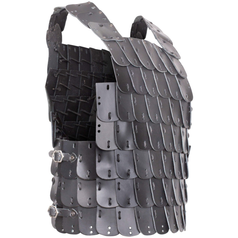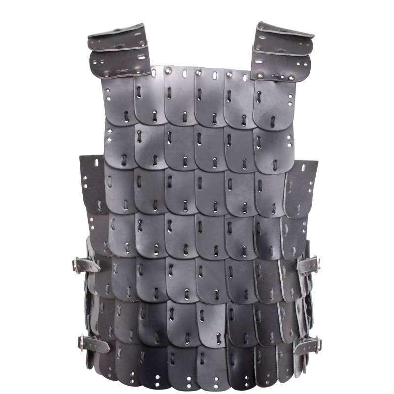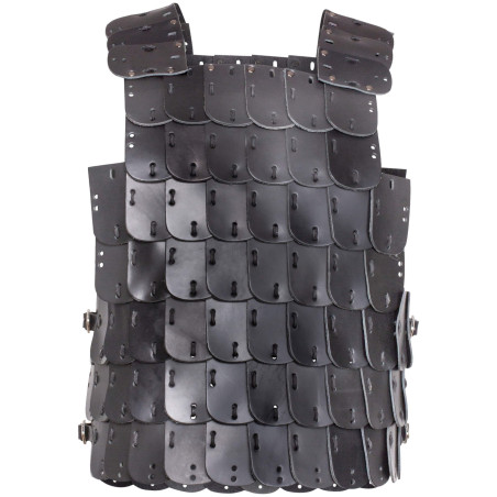 Klasyczna zbroja skórzana zaprojektowana na podstawie historycznych wzorców z różnych ilustracji. Łuski są kwadratowe i ułożone pionowo. Są połączone skórzanymi paskami, co zapewnia pełną ruchomość. Połącz tę zbroję z kamizelką wyściełającą i/lub koszulą łańcuchową, aby uzyskać jak najlepszą historyczną ochronę.
