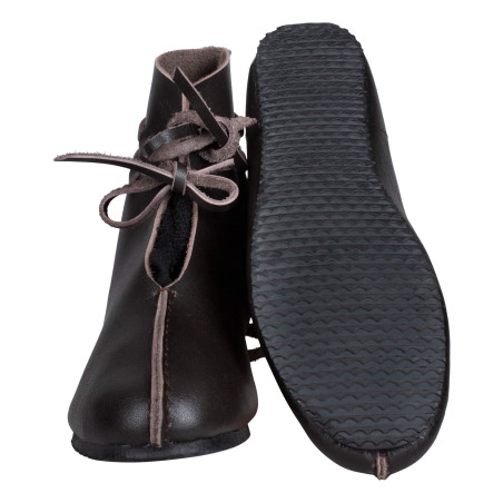 Przerobiliśmy nasze skórzane buty Einhard, aby lepiej dostosować je do użytku na zewnątrz. Solidne obuwie jest niezbędne podczas wydarzeń, ponieważ nie ma nic gorszego niż obolałe lub mokre stopy. Dlatego zdecydowaliśmy się na mocno przytwierdzoną gumową podeszwę. Te buty inspirowane są historycznymi wzorami i można je bezpiecznie zapiąć wokół kostki za pomocą dwóch skórzanych pasków. Trwała gumowa podeszwa posiada bieżnik, który zapewnia, że nie poślizgniesz się nawet na mokrym polu bitwy. Gruba wierzchnia skóra chroni przed brudem i deszczem, pod warunkiem, że jest dobrze natłuszczona.