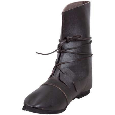 Nasze popularne buty Johann wykonane są z wysokiej jakości skóry, która wygodnie dopasowuje się do stopy. Solidna gumowa podeszwa zapewnia pewne oparcie na każdym terenie. Dekoracyjne skórzane paski nie tylko umożliwiają indywidualne dopasowanie, ale także nadają butom charakterystyczny urok. Buty te można łatwo łączyć z dowolnym strojem, dzięki czemu pozostajesz stylowy i wygodny — zarówno na średniowiecznym jarmarku, jak i podczas kolejnej przygody LARP.