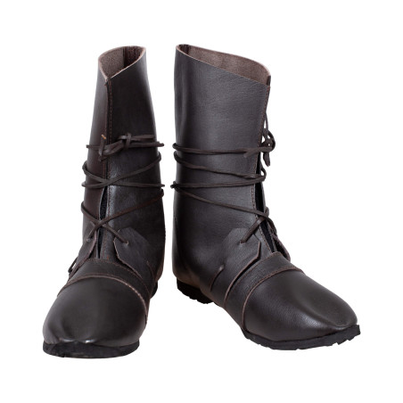 Nasze popularne buty Johann wykonane są z wysokiej jakości skóry, która wygodnie dopasowuje się do stopy. Solidna gumowa podeszwa zapewnia pewne oparcie na każdym terenie. Dekoracyjne skórzane paski nie tylko umożliwiają indywidualne dopasowanie, ale także nadają butom charakterystyczny urok. Buty te można łatwo łączyć z dowolnym strojem, dzięki czemu pozostajesz stylowy i wygodny — zarówno na średniowiecznym jarmarku, jak i podczas kolejnej przygody LARP.