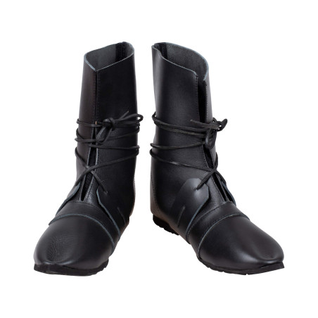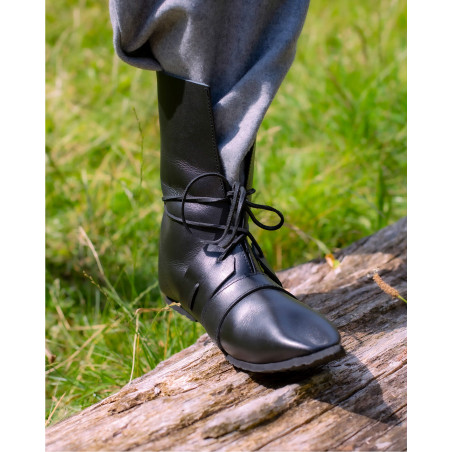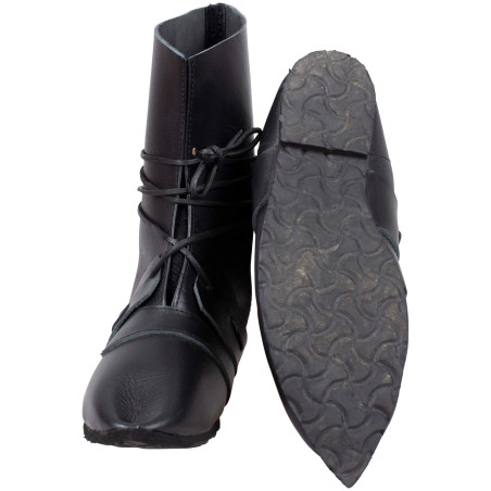 Nasze popularne buty Johann wykonane są z wysokiej jakości skóry, która wygodnie dopasowuje się do stopy. Solidna gumowa podeszwa zapewnia pewne oparcie na każdym terenie. Dekoracyjne skórzane paski nie tylko umożliwiają indywidualne dopasowanie, ale także nadają butom charakterystyczny urok. Buty te można łatwo łączyć z dowolnym strojem, dzięki czemu pozostajesz stylowy i wygodny — zarówno na średniowiecznym jarmarku, jak i podczas kolejnej przygody LARP.
