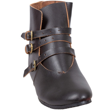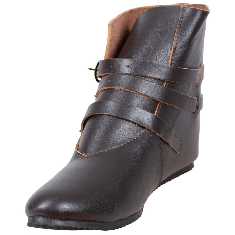 Odświeżyliśmy nasze buty za kostkę Raimund, aby jeszcze lepiej sprawdzały się w użytku na zewnątrz. Solidne obuwie to podstawa na wydarzeniach, ponieważ nie ma nic gorszego niż obolałe lub przemoczone stopy. Dlatego zdecydowaliśmy się na mocno przytwierdzoną plastikową podeszwę. Te buty inspirowane są historycznymi wzorami i zapinane na trzy paski. Wytrzymała plastikowa podeszwa posiada bieżnik zapobiegający poślizgom, nawet na mokrych polach bitewnych. Gruba skóra wierzchnia chroni przed brudem i deszczem, o ile jest odpowiednio natłuszczona.
