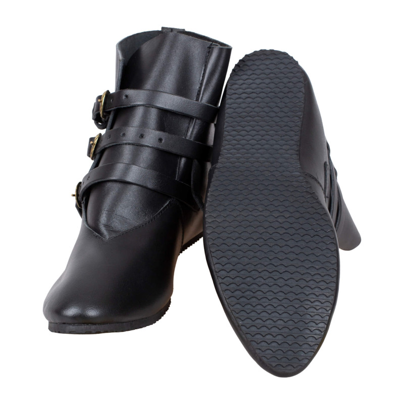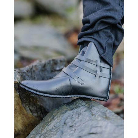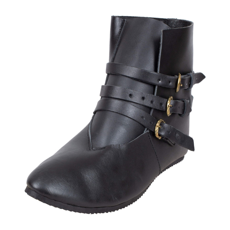 Odświeżyliśmy nasze buty za kostkę Raimund, aby jeszcze lepiej sprawdzały się w użytku na zewnątrz. Solidne obuwie to podstawa na wydarzeniach, ponieważ nie ma nic gorszego niż obolałe lub przemoczone stopy. Dlatego zdecydowaliśmy się na mocno przytwierdzoną plastikową podeszwę. Te buty inspirowane są historycznymi wzorami i zapinane na trzy paski. Wytrzymała plastikowa podeszwa posiada bieżnik zapobiegający poślizgom, nawet na mokrych polach bitewnych. Gruba skóra wierzchnia chroni przed brudem i deszczem, o ile jest odpowiednio natłuszczona.