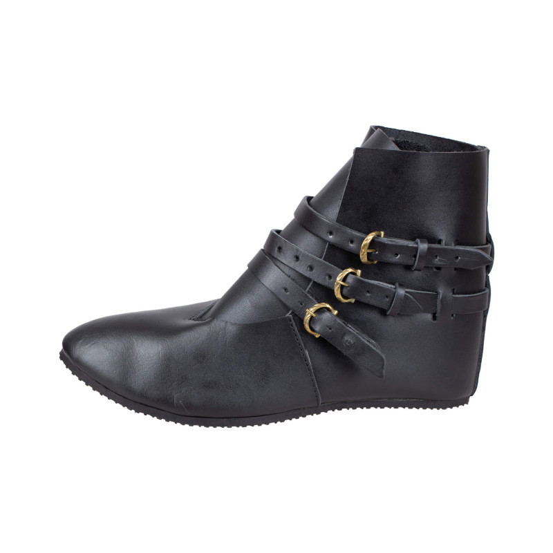 Odświeżyliśmy nasze buty za kostkę Raimund, aby jeszcze lepiej sprawdzały się w użytku na zewnątrz. Solidne obuwie to podstawa na wydarzeniach, ponieważ nie ma nic gorszego niż obolałe lub przemoczone stopy. Dlatego zdecydowaliśmy się na mocno przytwierdzoną plastikową podeszwę. Te buty inspirowane są historycznymi wzorami i zapinane na trzy paski. Wytrzymała plastikowa podeszwa posiada bieżnik zapobiegający poślizgom, nawet na mokrych polach bitewnych. Gruba skóra wierzchnia chroni przed brudem i deszczem, o ile jest odpowiednio natłuszczona.
