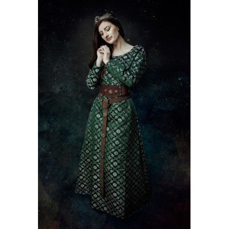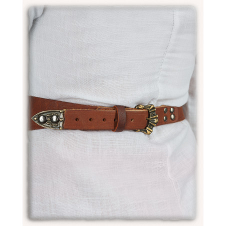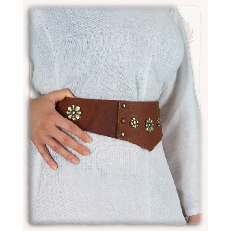 Szeroki damski pas z mosiężnymi zdobieniami, klamrą i zakończeniem.