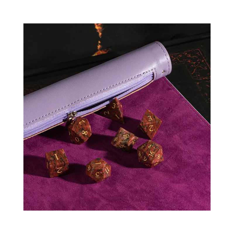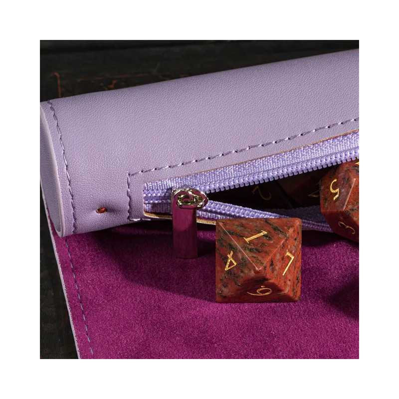 Dice tray jest wykonany ze skóry. Posiada kieszeń zamykaną na zamek, w której możemy przetransportować kostki. Całość można rozwinąć tworząc matę do rzucania kośćmi lub grania w karty.